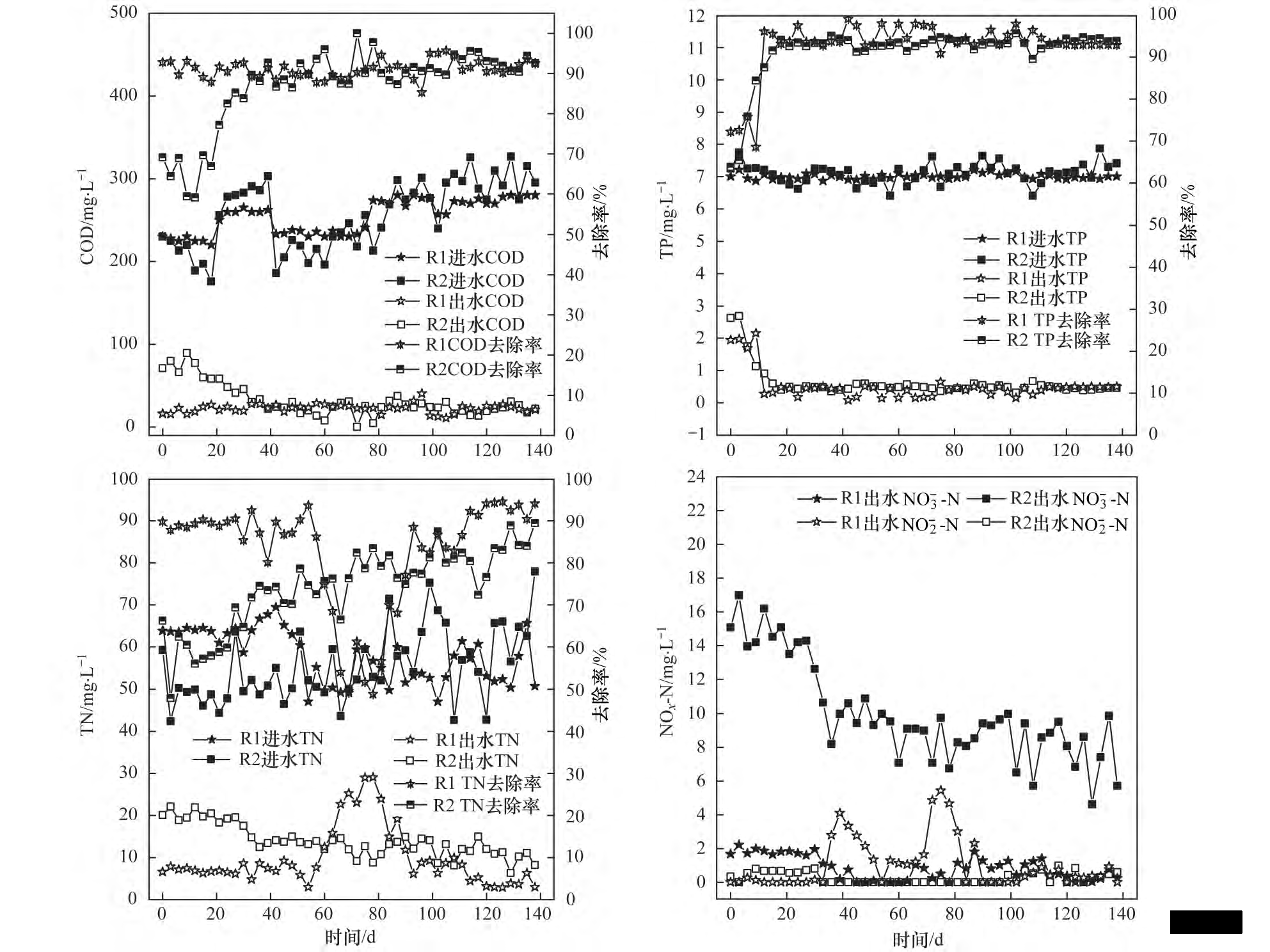 圖 5   R1 和 R2 反應器去除 COD、TP、TN 和 NO - -N 的性能