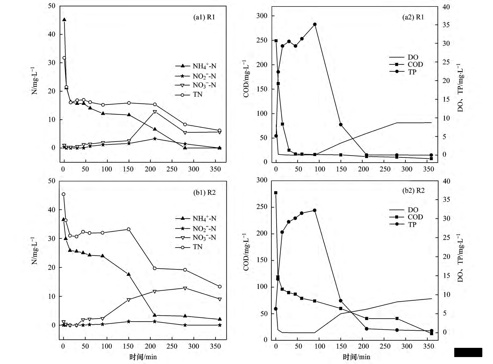 圖 6 為 R1、R2 在第 128 d 的一個典型周期內(nèi)NH + -N、NO - -N、NO - -N、TN、COD、TP、溶解氧4 2 3( DO) 的濃度變化. 厭氧階段,R1、R2 反應器內(nèi)的DO 濃度在 0. 02 mg·L - 1 以下,好氧階段,R1、R2中 DO 緩慢增加,最終穩(wěn)定在 8 mg·L - 1 左右,反應器內(nèi)具有良好的 A/ O 運行環(huán)境. R1 中 COD 濃度在厭氧階段下降較快,在前 30 min 已經(jīng)基本消耗,COD 由 250 mg·L - 1 降至 25. 12 mg·L - 1 . R2 反應器進水為生活污水,在厭氧階段,由于有機物成分復雜,微生物可快速利用的有機碳源較少,所以降解速度較慢, COD 由 275. 19 mg·L - 1 降至 90. 44mg·L - 1 ; 在好氧階段,反硝化作用消耗有機碳源,COD 濃度逐漸降低至 24. 58 mg·L - 1 ,COD 得到去除. 在厭氧末期,R1 釋磷較多,反應器內(nèi)的 TP 濃度為 35. 09 mg·L - 1 ,而 R2 反應器內(nèi)的 TP 濃度為32. 18 mg·L - 1 . 導致釋磷量不同的主要原因為生活污水中含有慢速生物降解物質和溶解性惰性物質等不利于聚磷菌利用的有機物,在厭氧階段不能夠完全降解,降低了釋磷量. 在周期實驗出水中,R1、R2 出水均未檢測到NH + -N、NO - -N,出水NO - -N濃度分別為 5. 65 mg·L - 1 、9. 67 mg·L - 1 ,產(chǎn)生這種現(xiàn)象的原因為,穩(wěn)定運行時,R1 中顆粒污泥粒徑較R2 大,由于好氧顆粒污泥內(nèi)部存在一個“缺氧區(qū)”,粒徑越大,顆粒污泥內(nèi)部的缺氧區(qū)越大,這為反硝化菌提供了良好的生存環(huán)境,提高了反硝化能力,因此 R1 反應器內(nèi)NO - -N的出水效果更好.