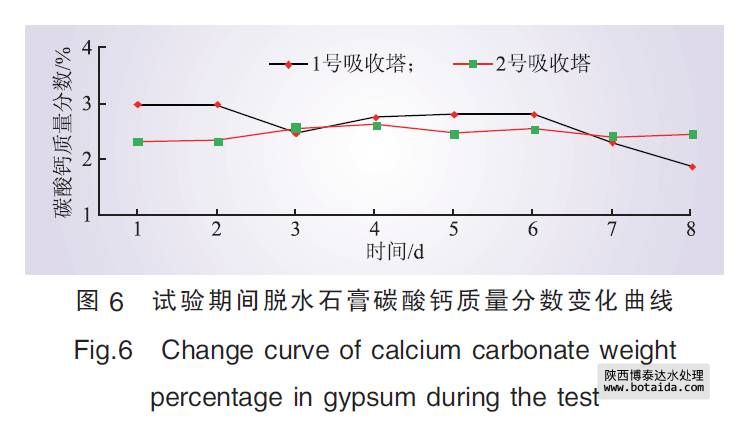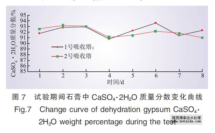 由圖3—7可以看出, 試驗(yàn)期間, 雖然混入處理后的工業(yè)廢水量不斷加大, 但脫硫系統(tǒng)漿液密度均能維持在1 130 kg/m3左右, 且脫硫效率仍然大于或等于95%; 脫硫副產(chǎn)品石膏品質(zhì)未發(fā)生明顯變化, 石膏的含水率基本保持在10%, 石膏中CaCO3質(zhì)量分?jǐn)?shù)小于3%, CaSO4· 2H2O純度大于90%, 符合商用石膏品質(zhì)要求。此外, 試驗(yàn)期間除霧器壓差處于正常運(yùn)行范圍之內(nèi), 吸收塔沒有發(fā)生起泡、堵塞等不正?,F(xiàn)象。試驗(yàn)結(jié)果表明, 處理后的工業(yè)廢水可用作脫硫工藝水。