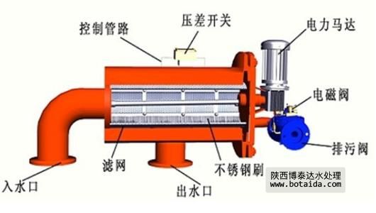 全自動過濾器由電機、電控箱、控制管路(包括控制閥和壓差變送器)、主管組件、濾芯組件、不銹鋼轉(zhuǎn)刷、框架組件、傳動軸、進出口連接法蘭等主要零部件組成。