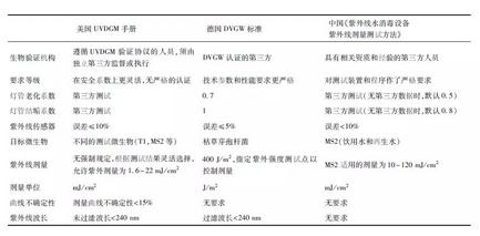 對(duì)比國(guó)內(nèi)外驗(yàn)證標(biāo)準(zhǔn),美國(guó)UVDGM手冊(cè)適用范圍相對(duì)較小。UVDGM手冊(cè)主要針對(duì)公共供水系統(tǒng)消毒,手冊(cè)中涵蓋了實(shí)施紫外線消毒系統(tǒng)的許多方面,但并沒有全面介紹所有類型的紫外線消毒系統(tǒng)、設(shè)計(jì)替代方案以及驗(yàn)證協(xié)議。德國(guó)DVGW標(biāo)準(zhǔn)適用于所有紫外線殺菌設(shè)備,目標(biāo)病原體涵蓋范圍廣。中國(guó)《紫外線水消毒設(shè)備紫外線劑量測(cè)試方法》(GB/T 32092—2015)分別對(duì)飲用水、再生水和污水規(guī)范了不同的目標(biāo)微生物,涉及范圍廣。表1為國(guó)內(nèi)外驗(yàn)證標(biāo)準(zhǔn)的對(duì)比,這些規(guī)范指導(dǎo)原則不同,但都推動(dòng)了紫外線技術(shù)在全球范圍內(nèi)的推廣和運(yùn)用,為公共飲用水安全保障做出了貢獻(xiàn)。