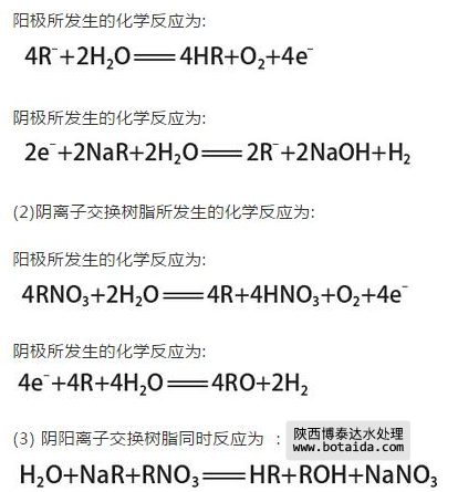在利用滲析的極化過程中,由于在水溶液中會產(chǎn)生H+和OH-,使樹脂在化學(xué)反應(yīng)中進(jìn)行電化學(xué)再生,這對水質(zhì)的提升具有正面的影響,而在再生的過程中,如果不進(jìn)行離子交換處理,就會造成水質(zhì)變壞,這樣就需要采用適宜的工作環(huán)境,才能達(dá)到提高水質(zhì)的要求,采用EDI裝置的離子交換樹脂技術(shù),可以有效的提高水質(zhì)。具體的化學(xué)反應(yīng)方程式如下,