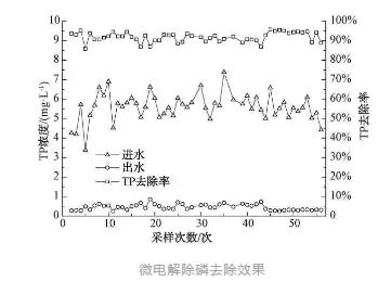 微電解除磷去除效果如下圖所示, 進(jìn)水 TP 濃度為3.5~7 mg/L,平均濃度為5.64 mg/L。當(dāng)進(jìn)水TP濃度為3.5~5 mg/L時,出水TP濃度穩(wěn)定于0.5 mg/L以下,達(dá)到一級A標(biāo)準(zhǔn);當(dāng)進(jìn)水TP濃度在5~7 mg/L時,出水TP濃度穩(wěn)定小于1 mg/L,達(dá)一級B標(biāo)準(zhǔn);平均去除率為91.84%~95%。項目試驗結(jié)果表明,微電解除磷-砂濾技術(shù)可有穩(wěn)定高效的除磷效果,出水TP穩(wěn)定達(dá)標(biāo)。